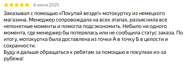 «По итогу, мотокуртка была доставлена из точки А в точку Б в целости и сохранности. Но главное даже не это. Главное — я получил работающий инструмент. Теперь я знаю, что если увижу что-то нужное в Европе или США, это не будет невозможно. Буду и дальше обращаться к ребятам за помощью в покупках из-за рубежа!» — резюмирует клиент.