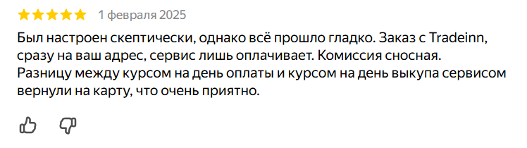 «Заказ с Tradeinn, сразу на ваш адрес, сервис лишь оплачивает, — поясняет Денис. — Комиссия сносная. Меня это устроило. Я сам все проверил, сам оформил заказ на Tradeinn, указал адрес. А они просто оплатили».