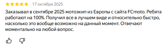 «Заказывал в сентябре 2025 мотоэкип из Европы с сайта FCmoto, — делится Максим. — Ребята работают на 100 %. Получил все в лучшем виде и относительно быстро, насколько это вообще возможно на данный момент».